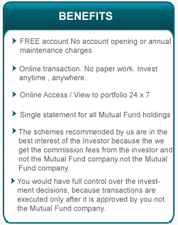 | If you are a seasoned investor, who has been investing in the capital markets directly or indirectly through mutual funds for a long time, and you feel that you can invest in mutual funds on your own without seeking any advice, this service is appropriate for you. According to this service, you will be provided a FREE online investment account, without having to pay any account opening or annual maintenance charges. You will be able to invest through this online account from ANYWHERE, ANYTIME using your online bank account. You will be able to manage your portfolio in better way, because now you will not have to look for different account statements from various mutual fund companies, as all your mutual fund investments through us will be reflected on a single holding statement which will be available on our website 24x7.